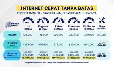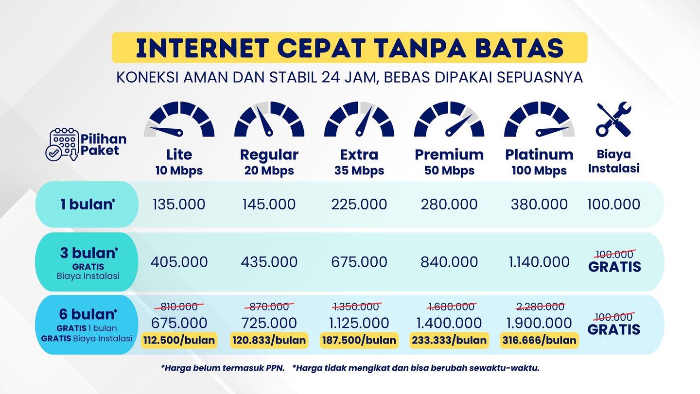 Nikmati internet cepat tanpa batas dengan harga bersahabat, dukungan teknis responsif dan paket fleksibel untuk semua kebutuhan.